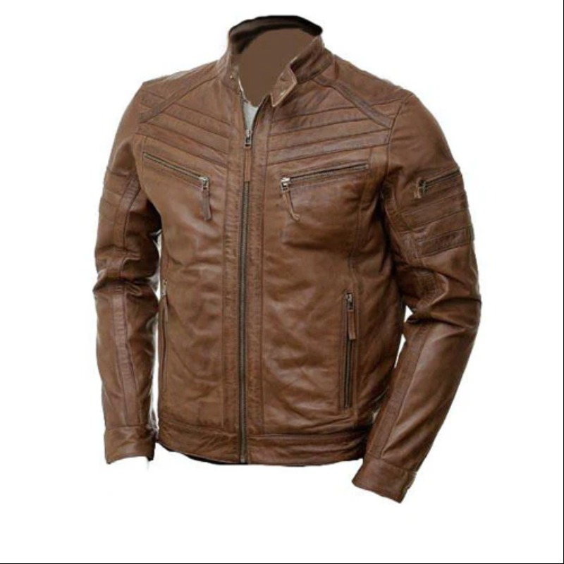 Fitted Style Mens Biker Real Leather Jacket Zip Up Quilted Popular Coat Tan